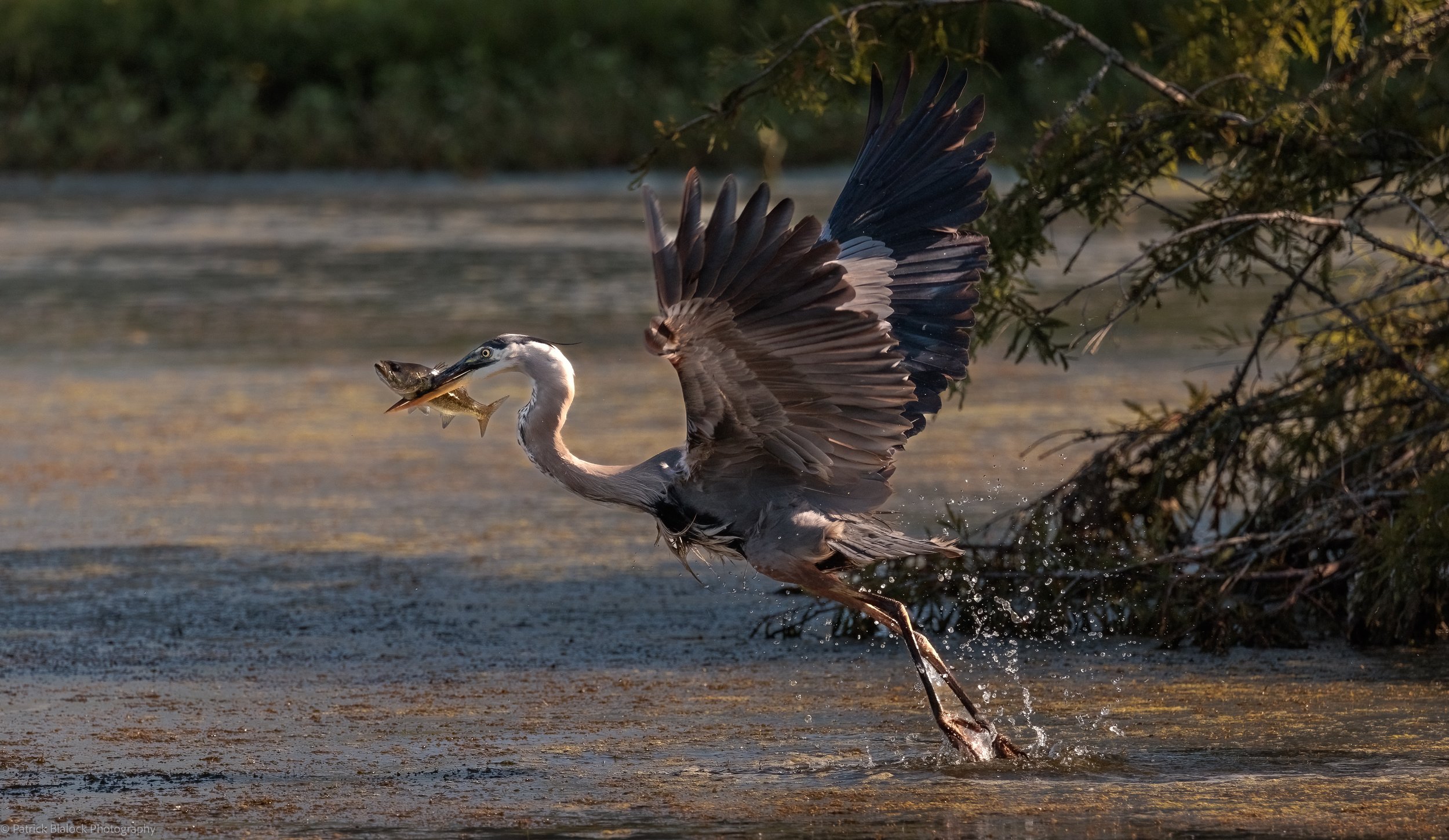 Great Blue Heron flys away with its catch.